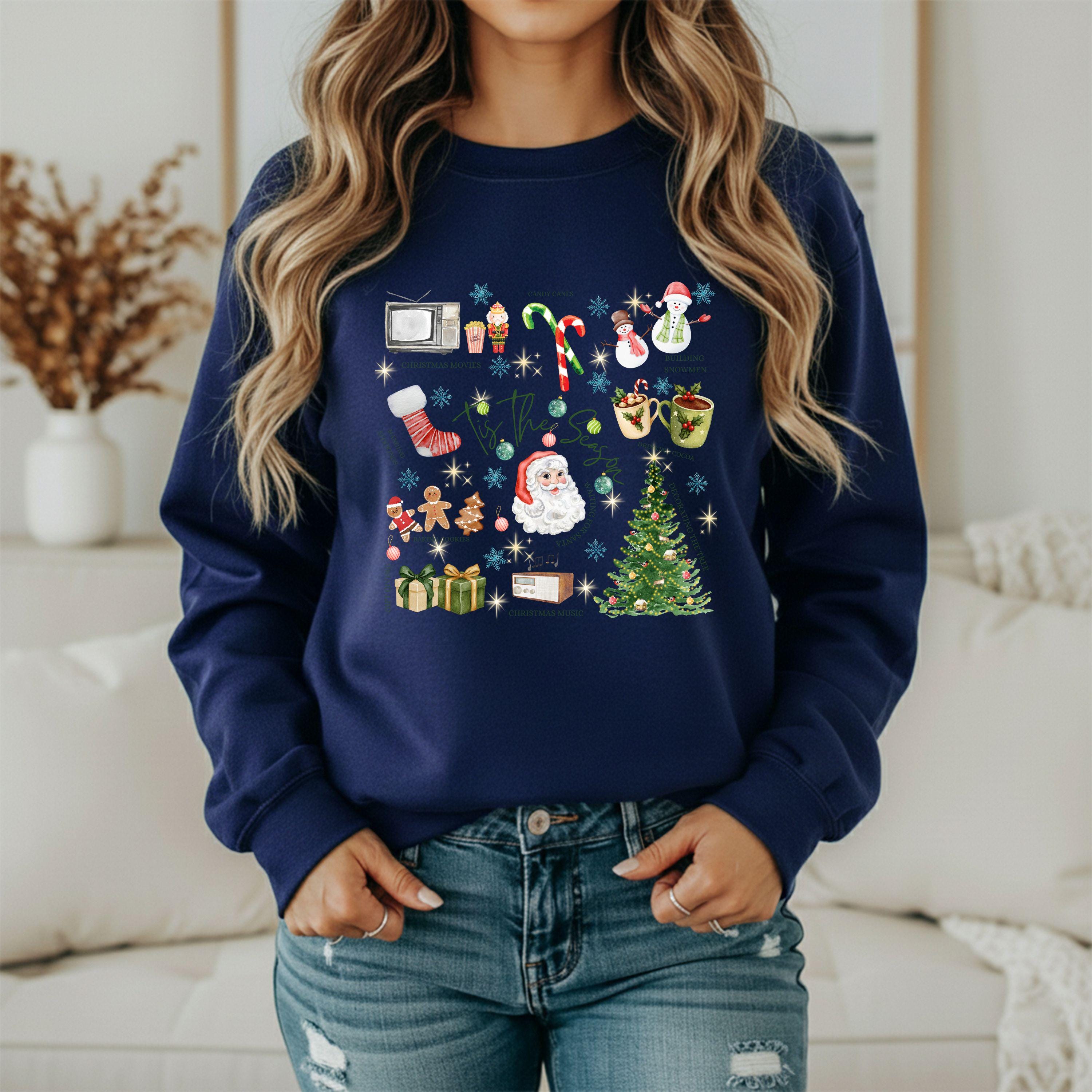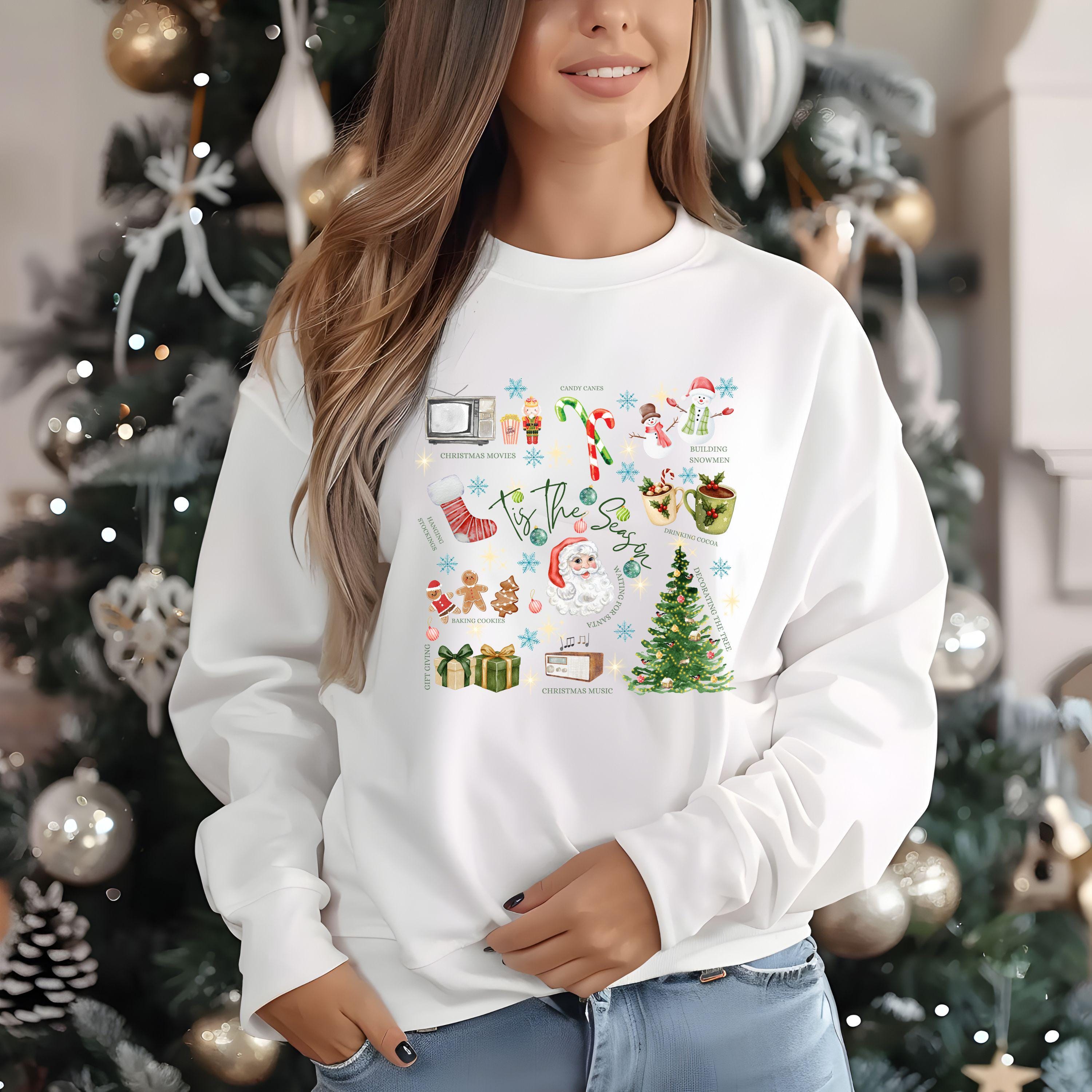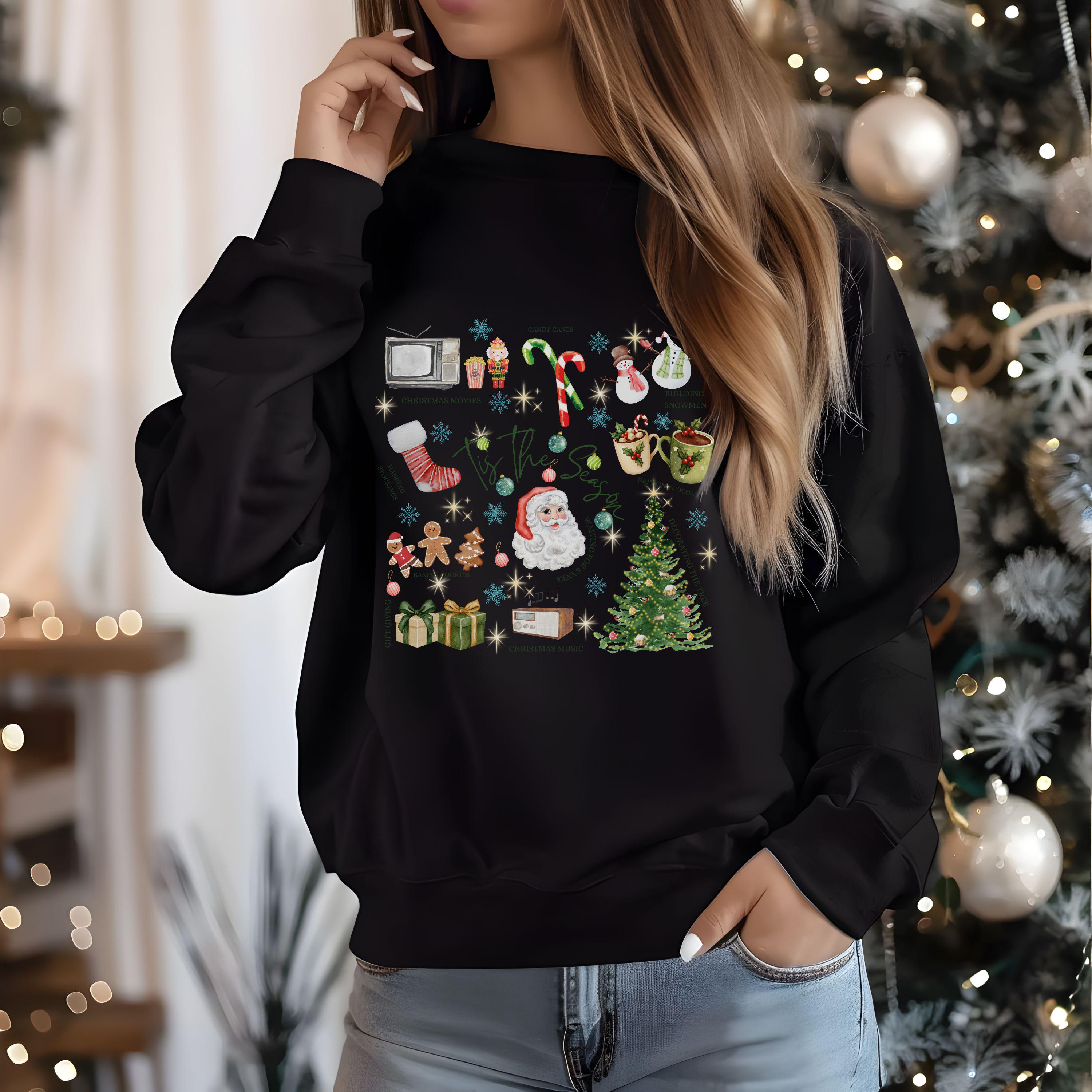 Get ready for the coziest time of the year! This adorable âTis The Season sweatshirt brings together everything we love about the holidays â festive nostalgia, warmth, and pure joy. With its charming illustrations of Santa Claus, gingerbread cookies, candy canes, cocoa mugs, and Christmas trees, itâs the perfect piece to wear while baking cookies, decorating your home, or watching your favorite Christmas movies.