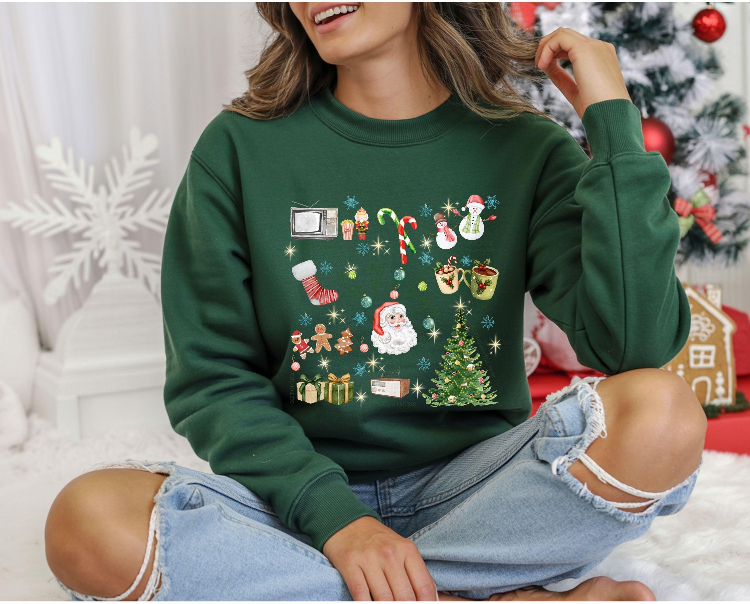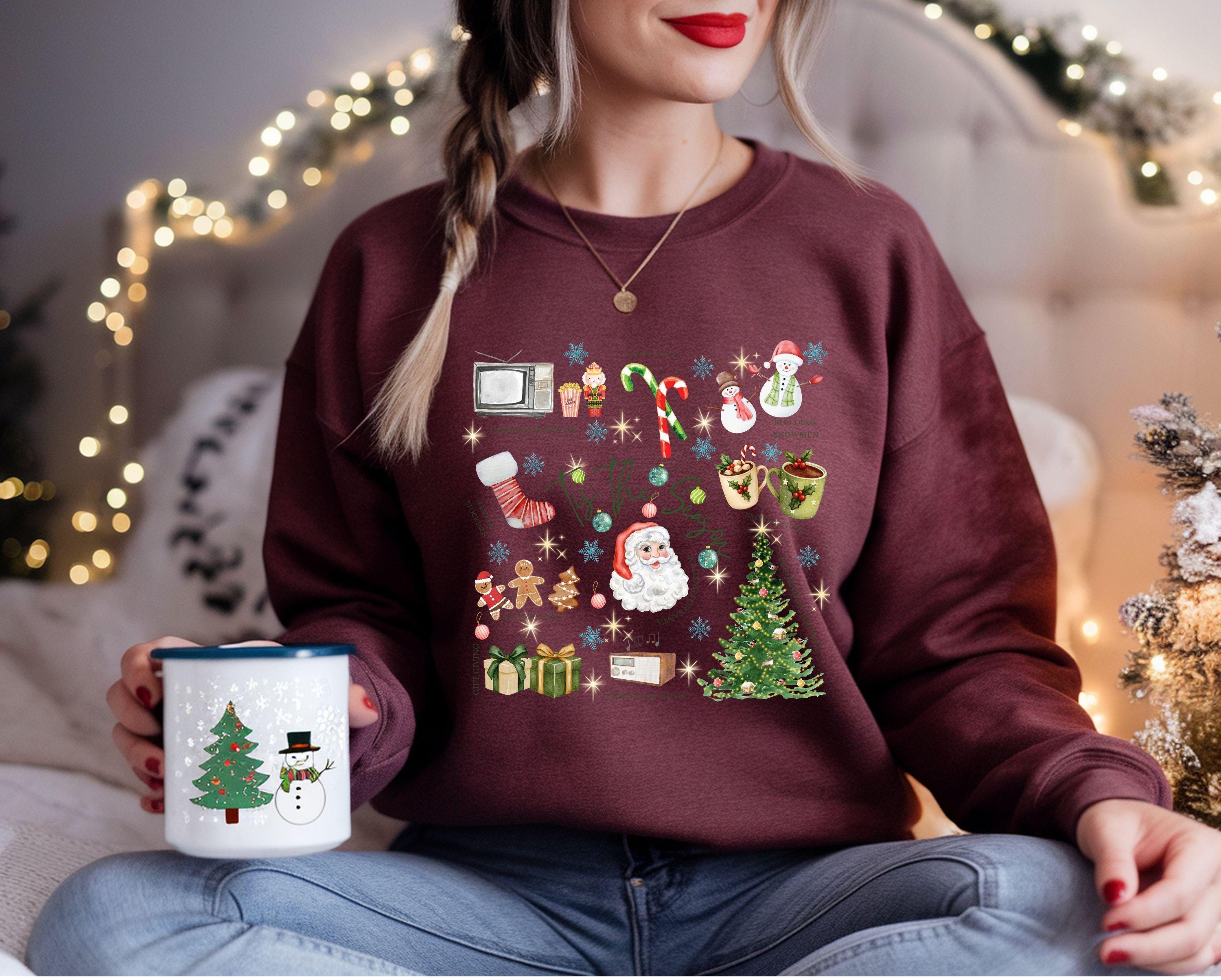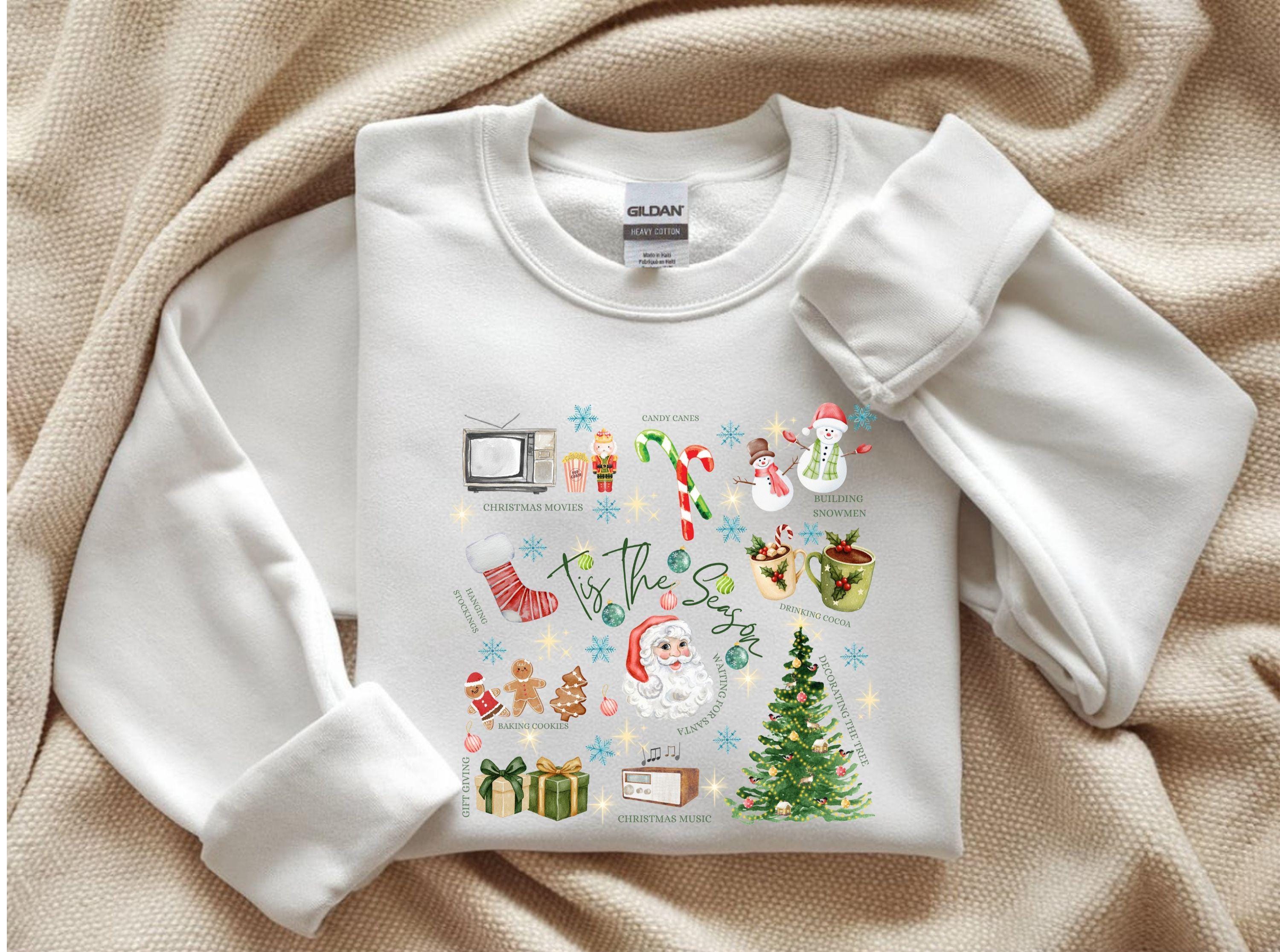 Get ready for the coziest time of the year! This adorable âTis The Season sweatshirt brings together everything we love about the holidays â festive nostalgia, warmth, and pure joy. With its charming illustrations of Santa Claus, gingerbread cookies, candy canes, cocoa mugs, and Christmas trees, itâs the perfect piece to wear while baking cookies, decorating your home, or watching your favorite Christmas movies.