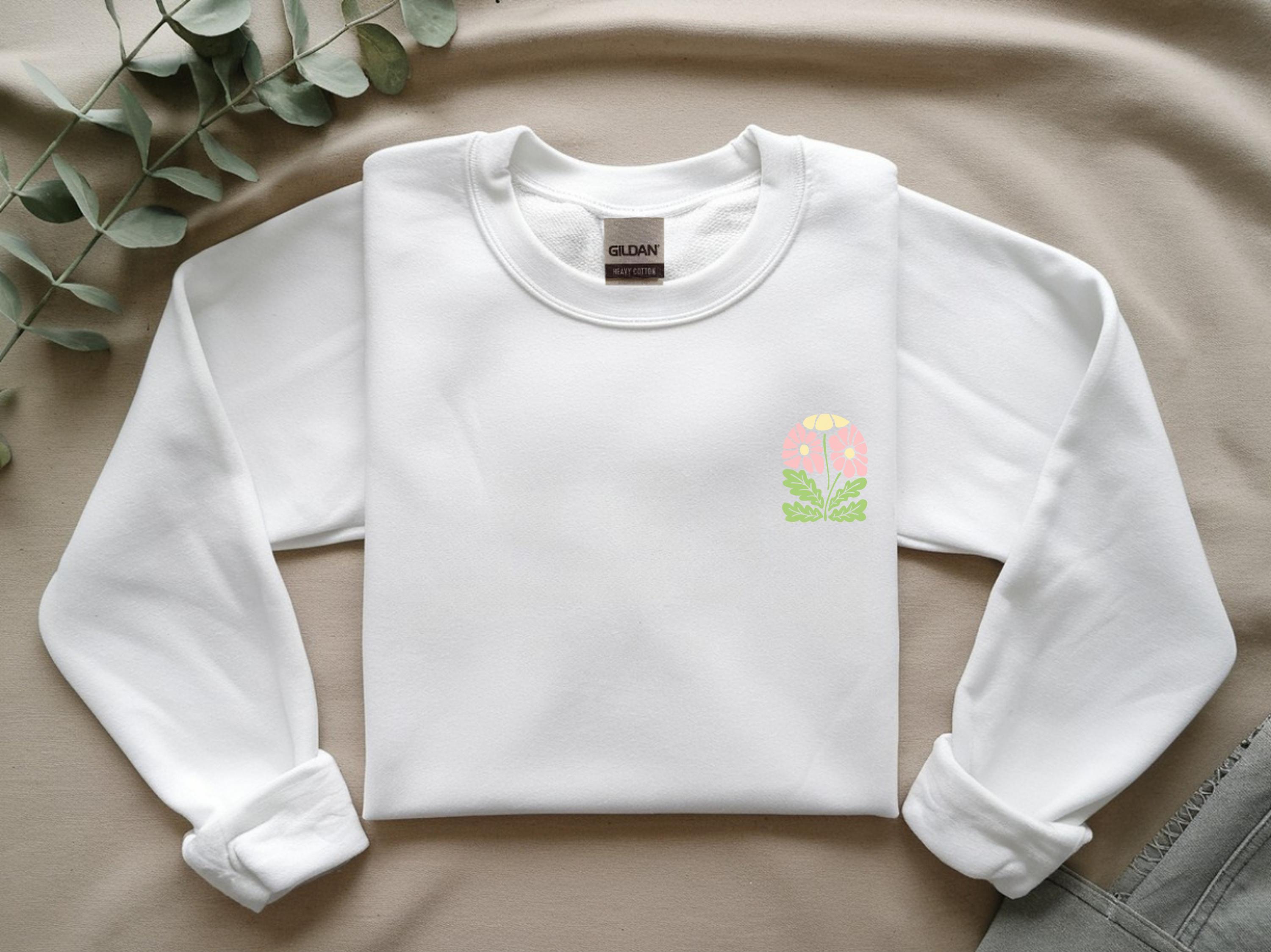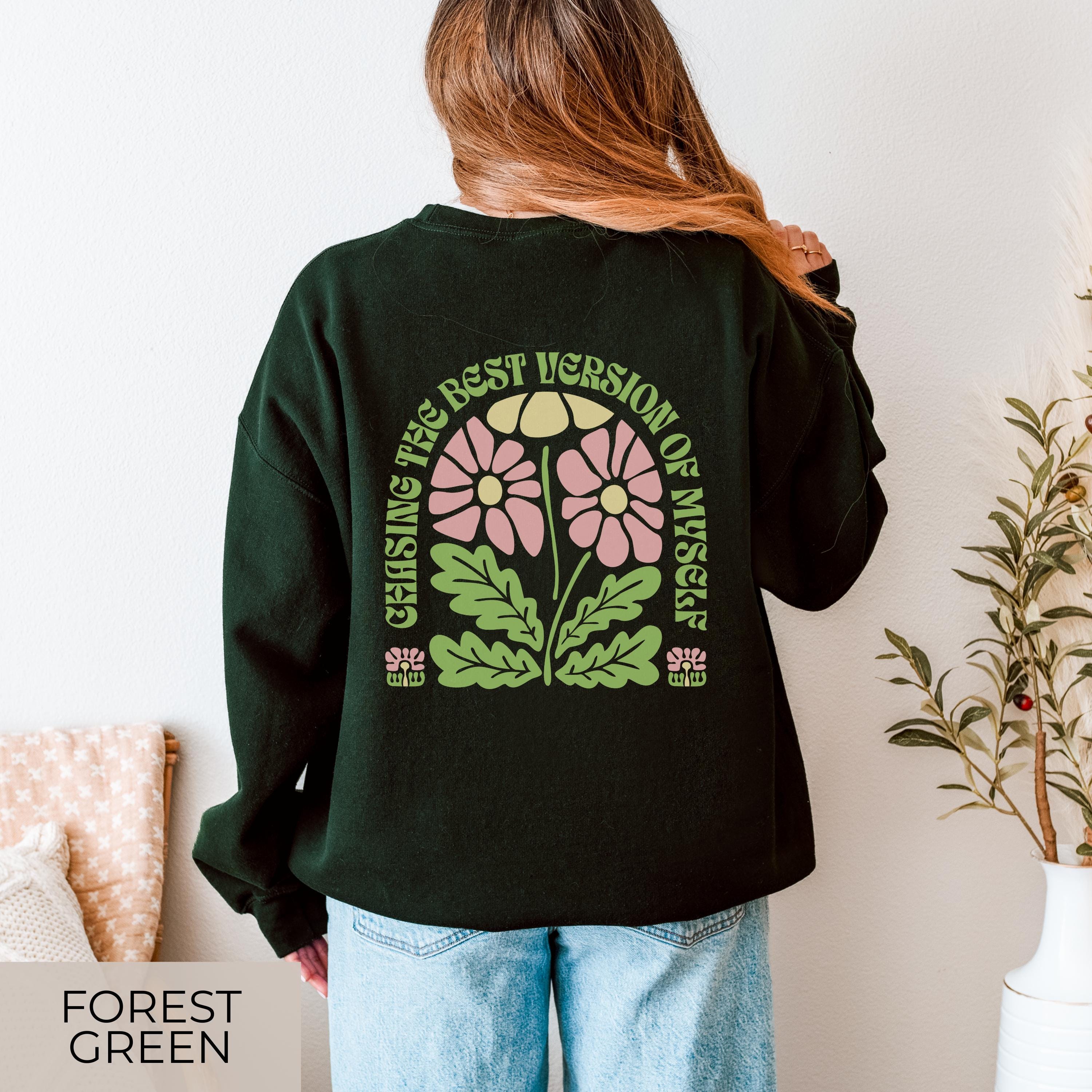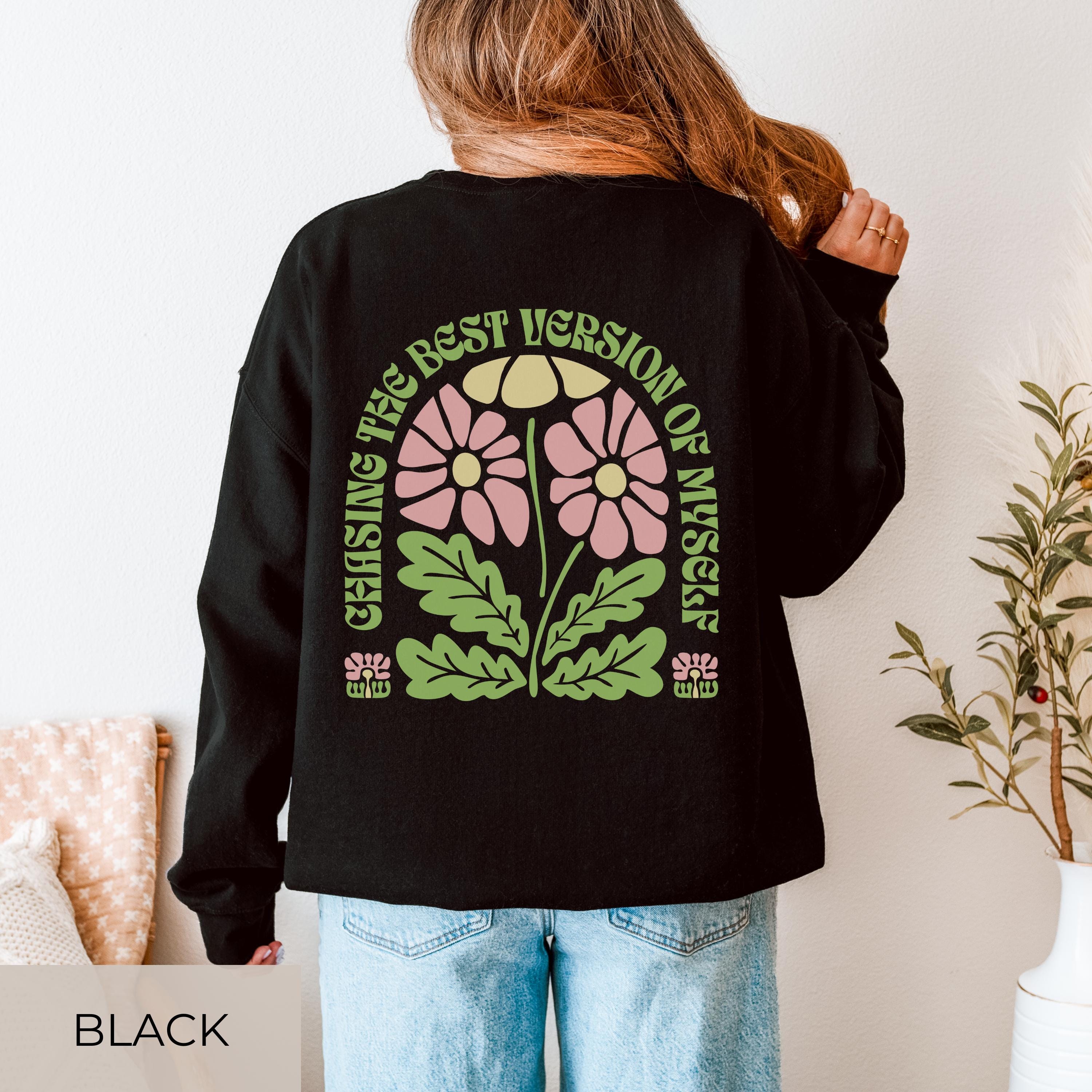 đ¸ Chasing the Best Version of Myself â the sweatshirt that reminds you daily how far youâve come. This cozy Gildan 18000 sweatshirt with front and back print blends self-love energy, healing vibes and a cute retro floral design. The bold back graphic paired with the delicate front print creates a unique look that's both comforting and stylish.