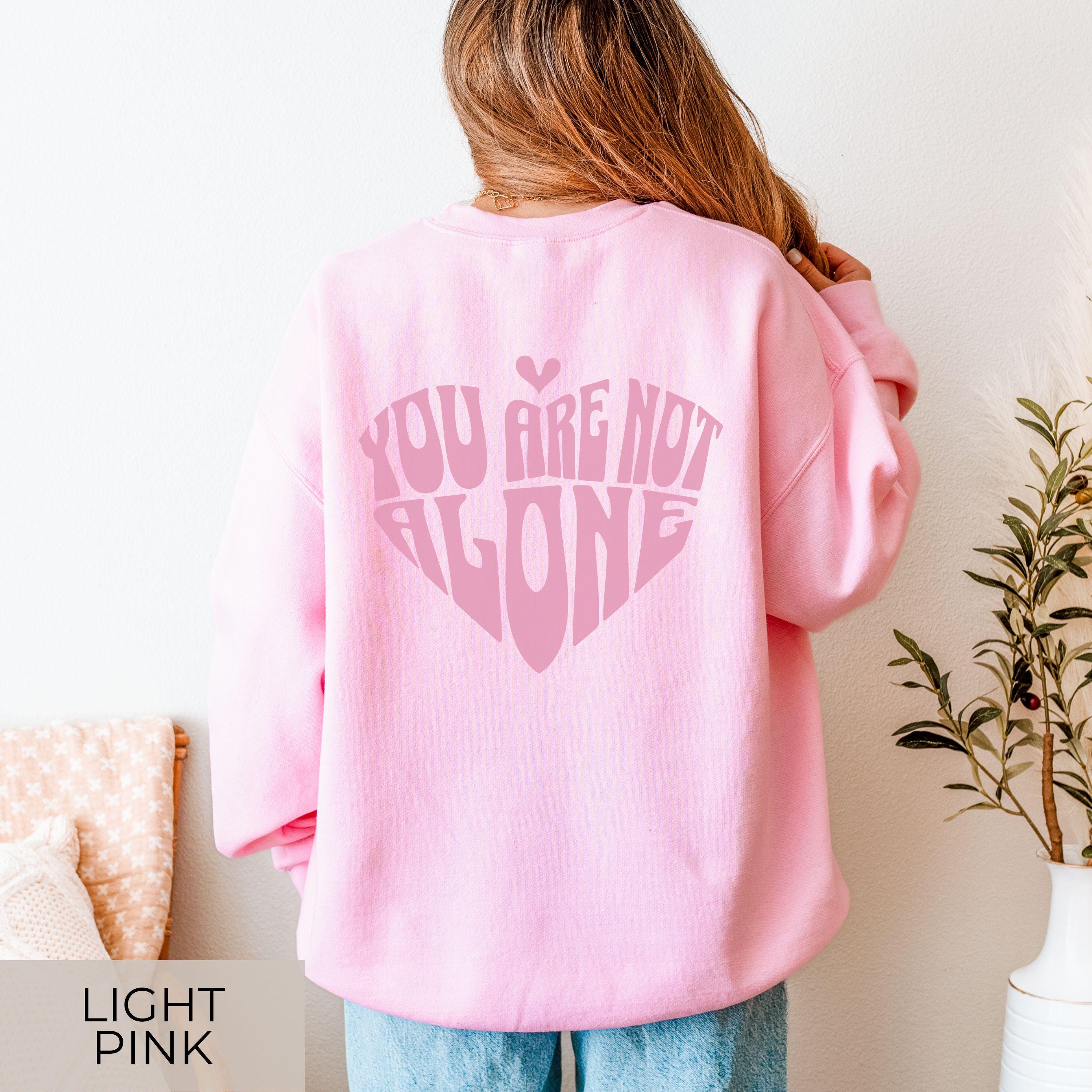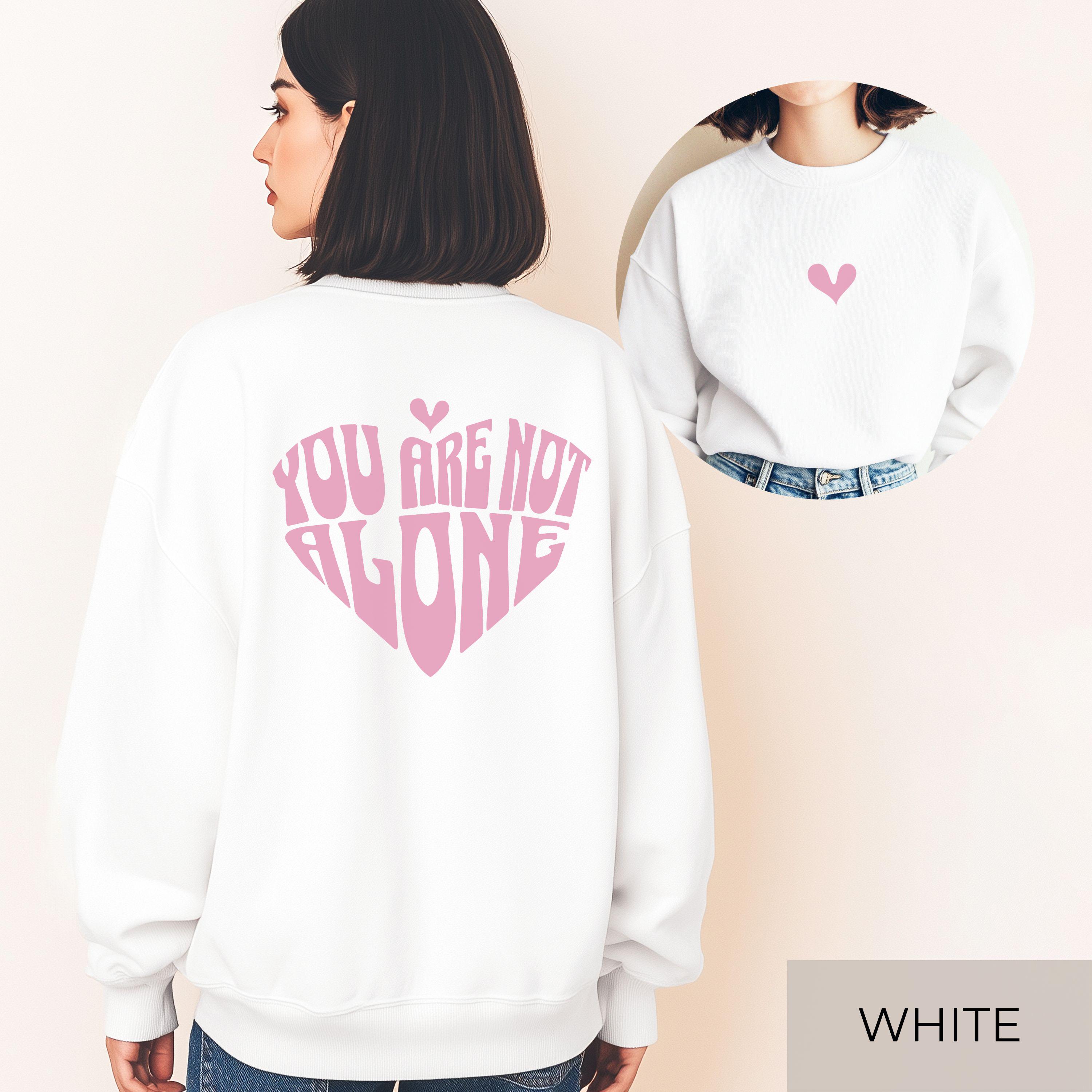 This cozy Gildan 18000 crewneck comes with a minimal heart design on the front and a large, soft-pink “You Are Not Alone” heart graphic on the back. It’s the perfect sweater for anyone who wants comfort, warmth, and a gentle message of support throughout the day.
