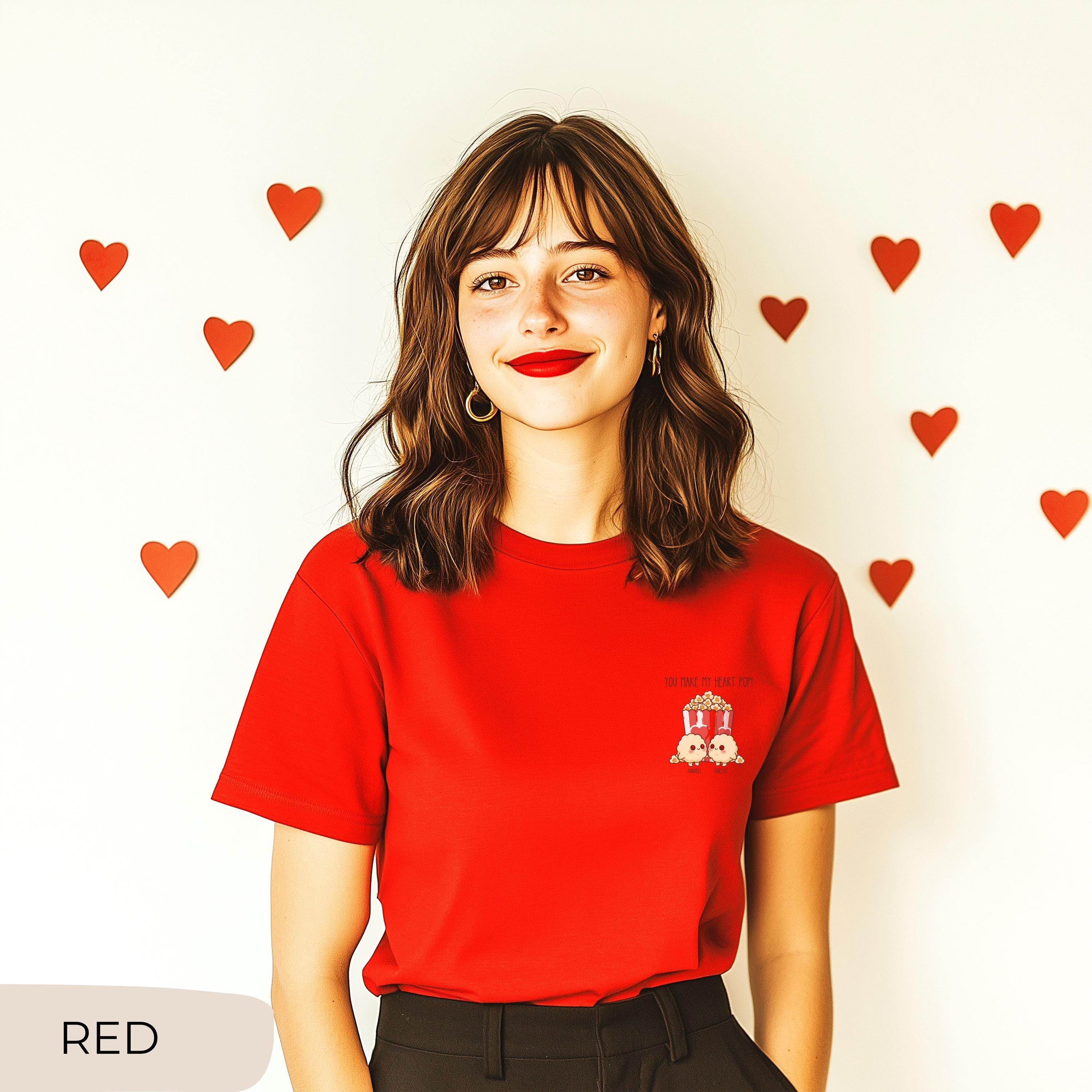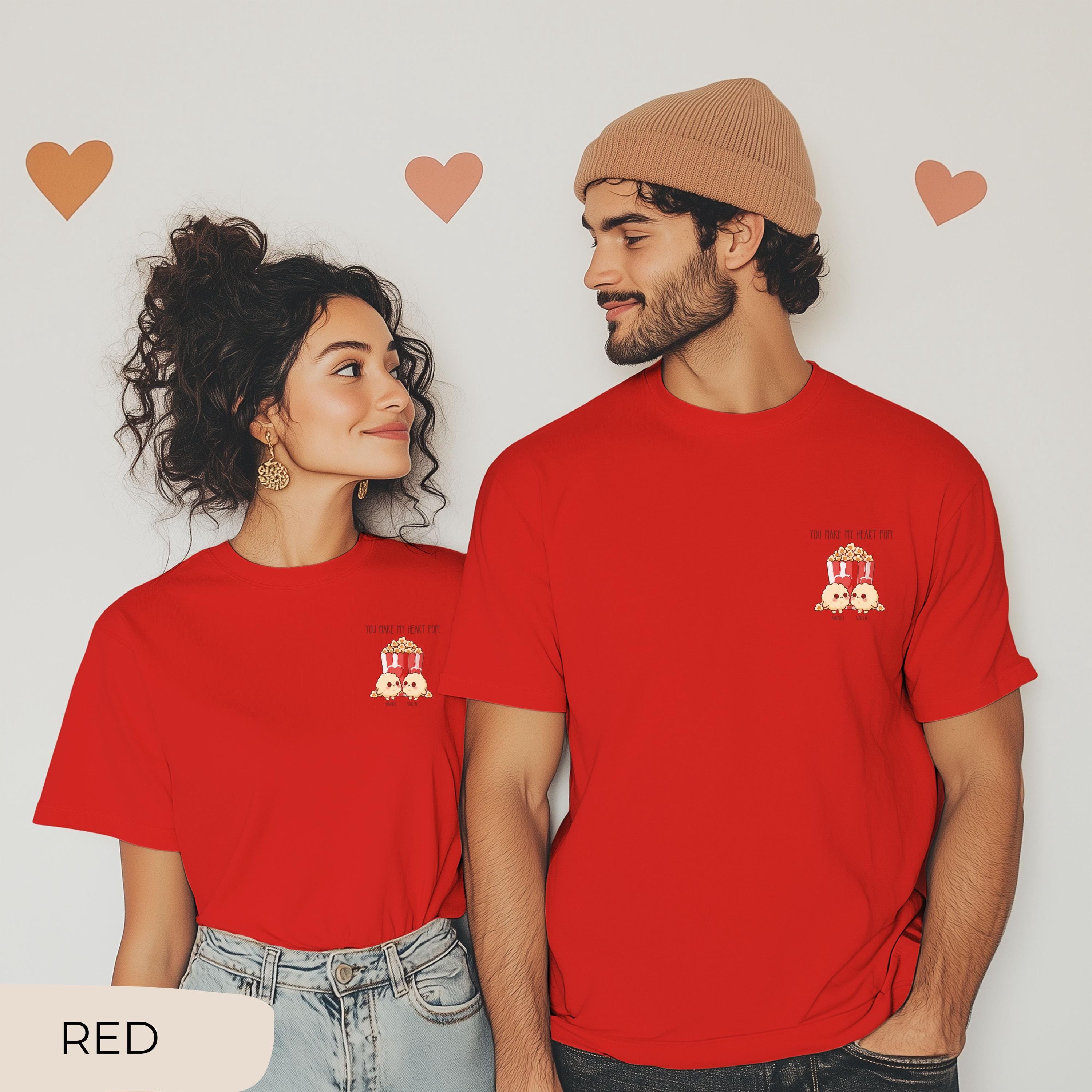 Personalized Valentine’s Day couple t-shirt with names – Bella+Canvas 3001 unisex tee, cute popcorn design “You Make My Heart Pop”, romantic gift.
