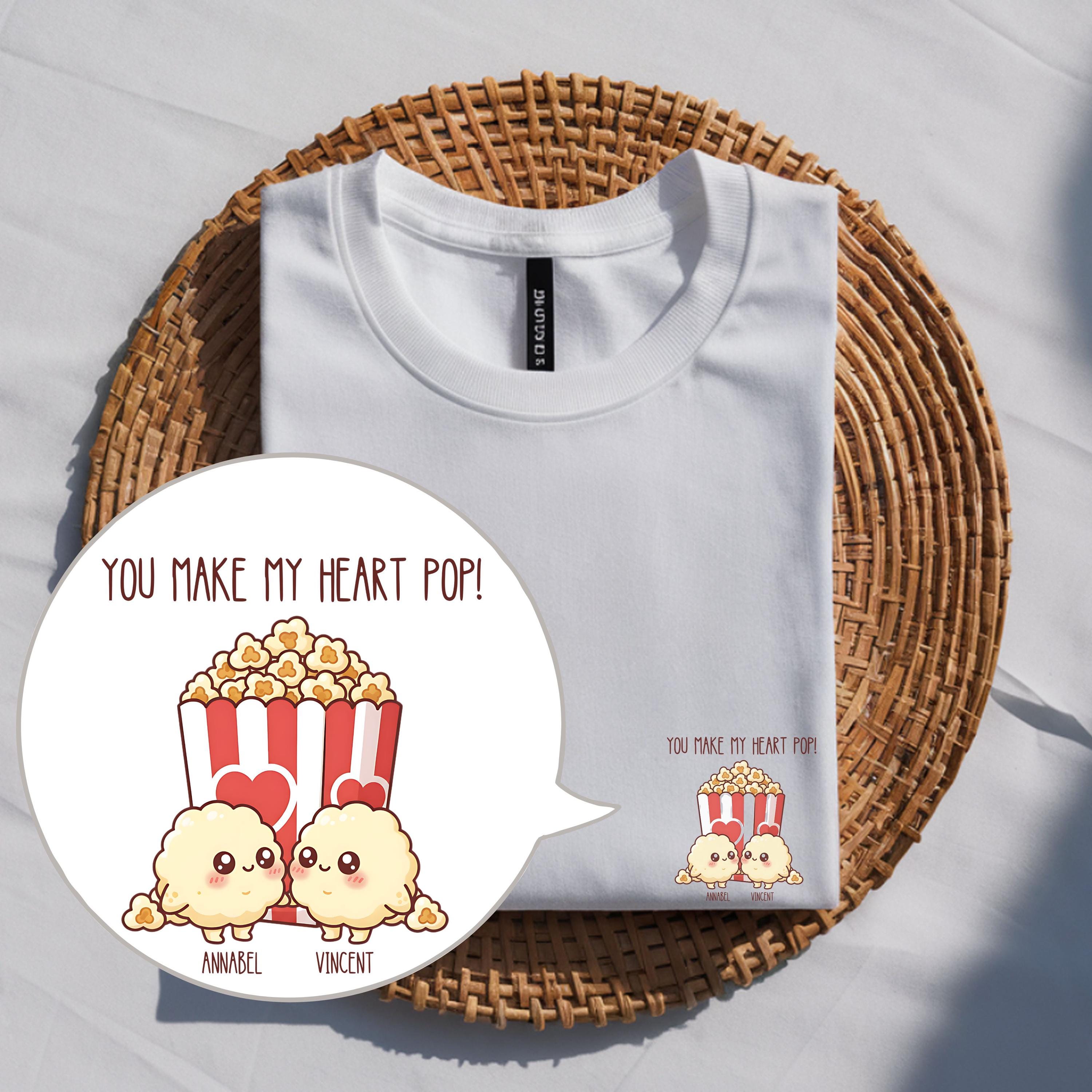 Featuring a cute popcorn couple with a heart design, this shirt can be personalized with two names, making it a truly meaningful and unique gift.