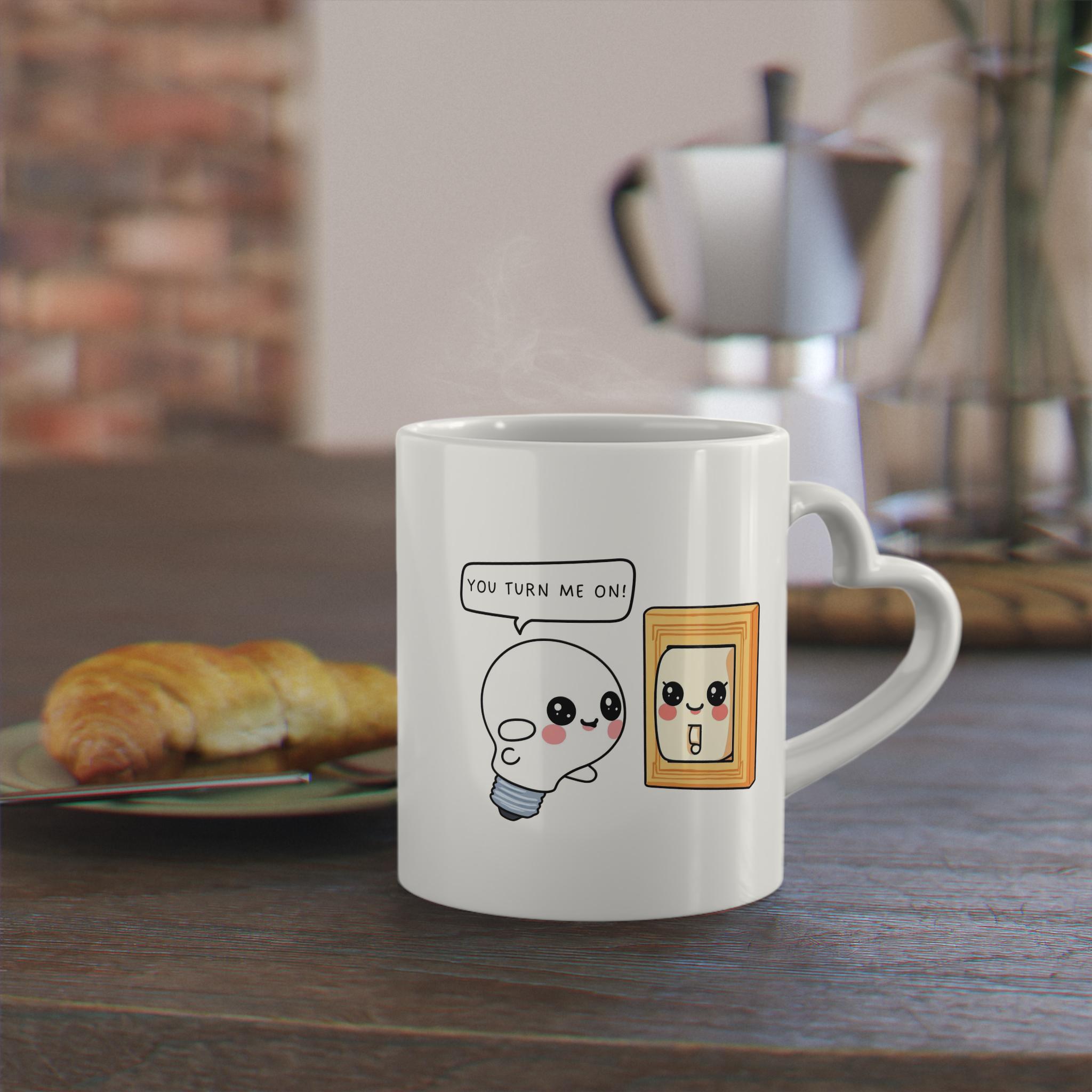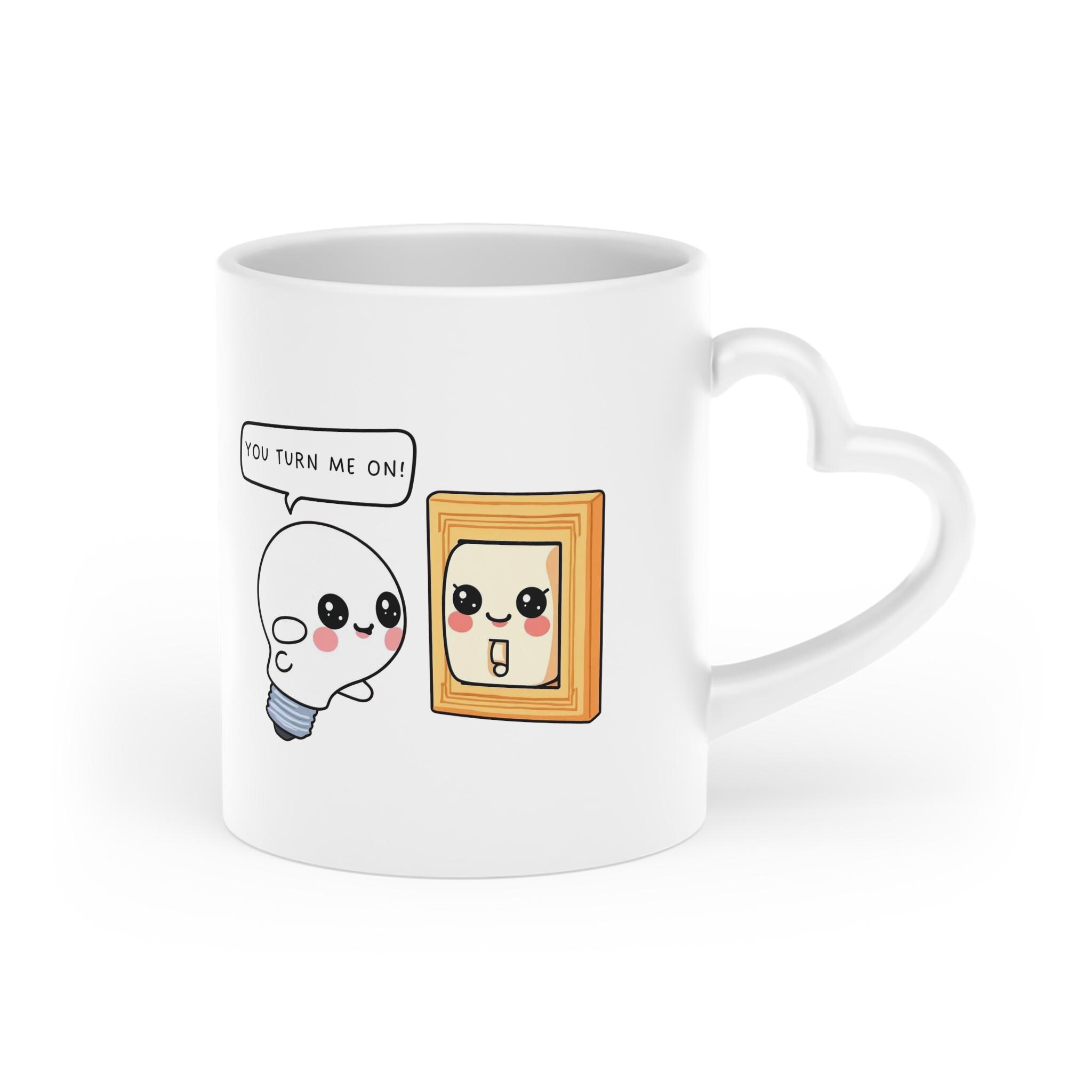 This heart-handle ceramic mug features an adorable kawaii light bulb flirting with a smiling light switch and the cheeky line: “You turn me on!” — a perfect little inside joke for couples.